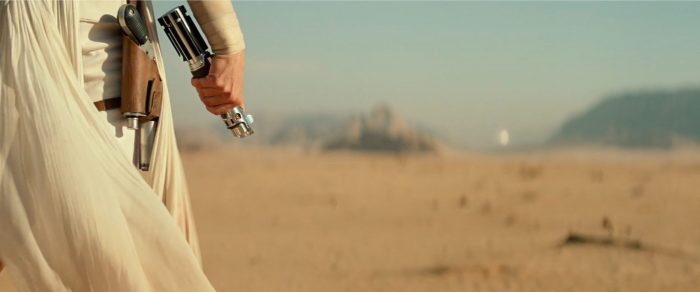 Shot 1 – (14 Seconds) First we hear Rey’s heavy breathing before we open on a medium shot of Rey in a desert. It is likely that we are either on the planet Jakku (her childhood home world where her parents orphaned her) or Tatooine (her mentor Luke Skywalker’s childhood home world). She is visibly distressed and glistening in the heat, but begins to control her breathing as we zoom in to center on her face and then pan down to her tool belt as she un-holsters her lightsaber with her right hand and pulls it across her body, left to right. Rey is wearing what can only be described as a beige Jedi monk outfit.